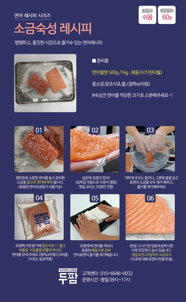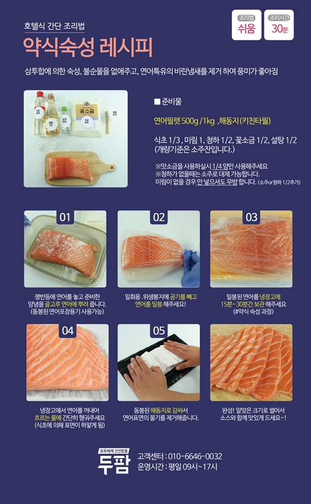 연어필렛을 식초 또는 소금 (물 : 500L 당 1스푼)을 차가운물(얼음물)에 담가놓고 겉면을 손바닥으로 문지르거나 흔들어서 세척한후 해동지로 수분을 닦아내고, 새 해동지로 연어를 덮고 냉장고 20분 정도 보관하고 드시면 비린내를 없애고, 탄력있게 드실수 있습니다.