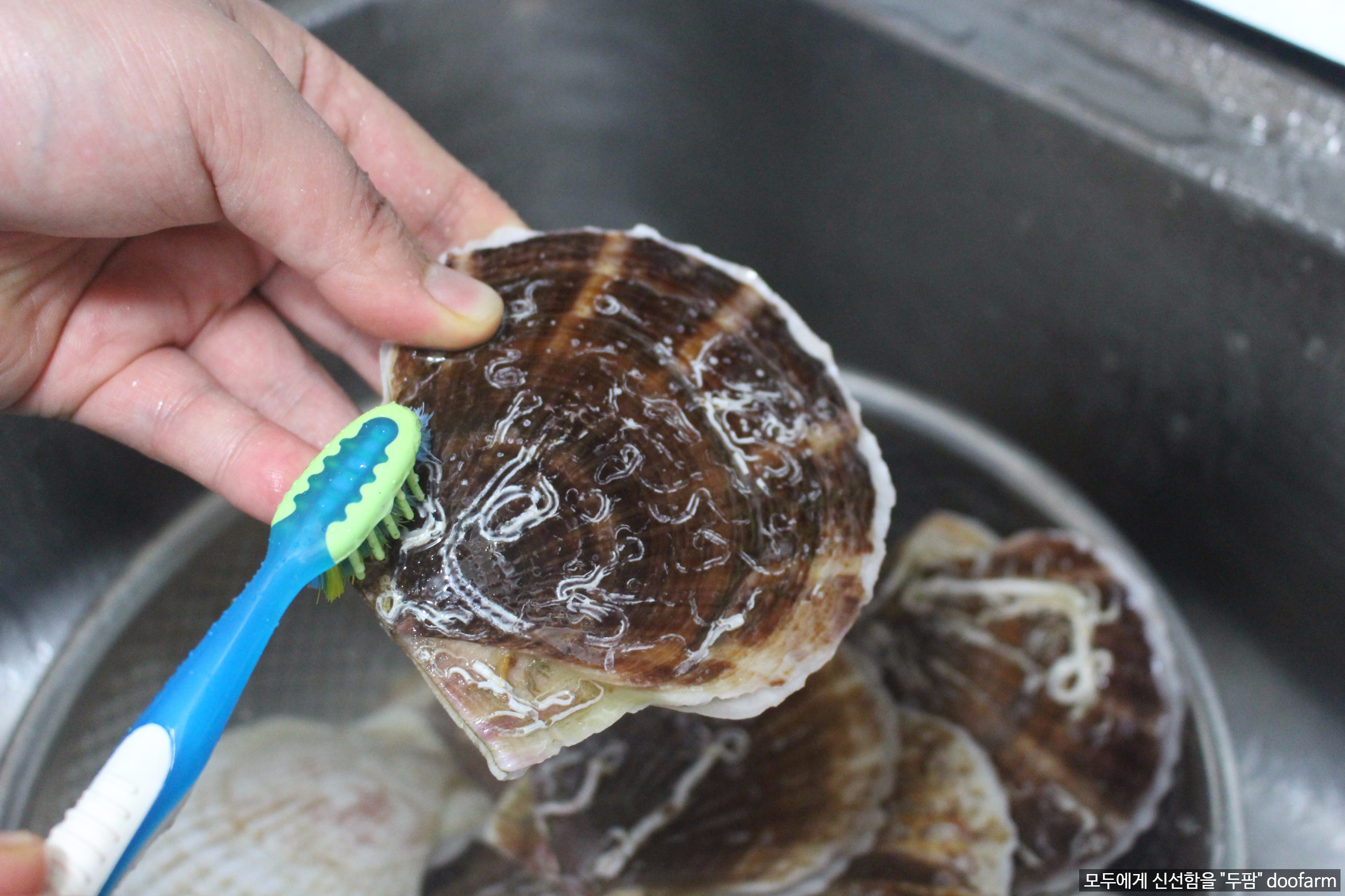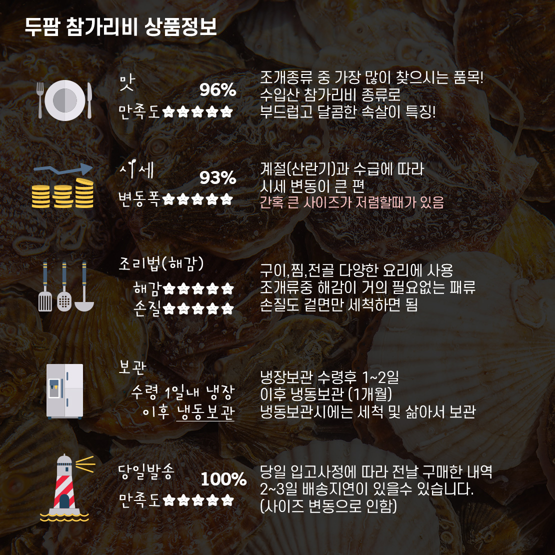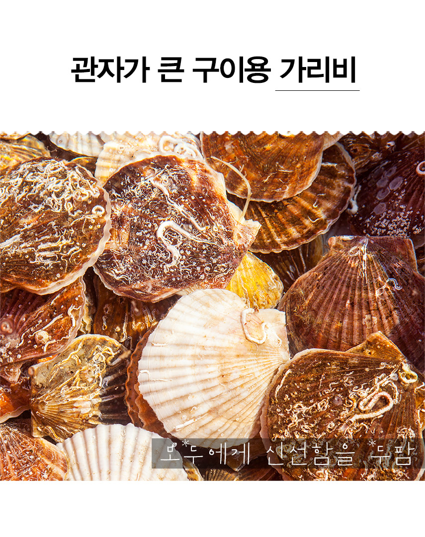 가리비 껍질에 붙어있는 쩍이나 뻘은 자연적 현상이니 조리전 흐르는 물에 솔등으로 세척 후 드시면 아무 문제가 없습니다.
