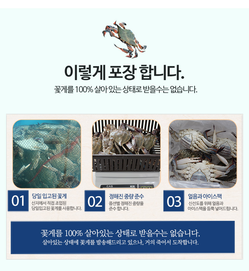 최상의 선도를 위해, 꽃게는 얼음에 직접 닿는 방식으로 포장하여 발송됩니다. 이로 인해 배송 중 생물